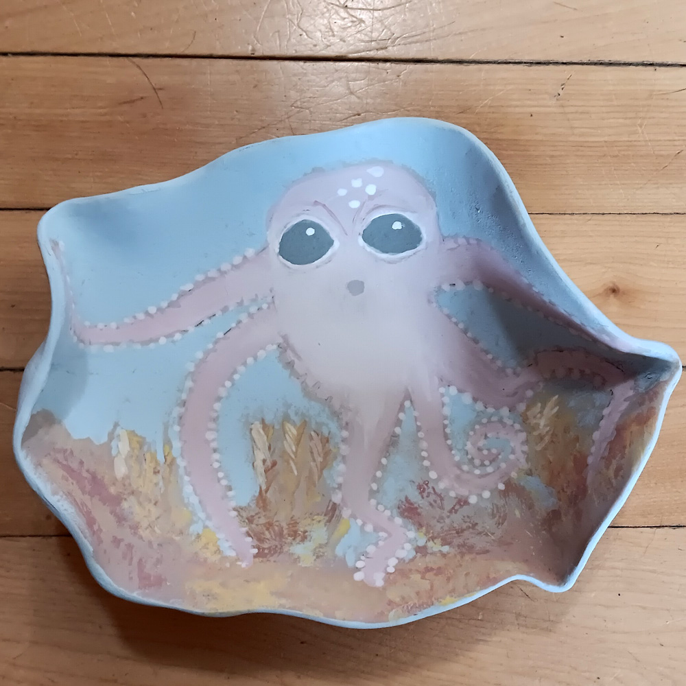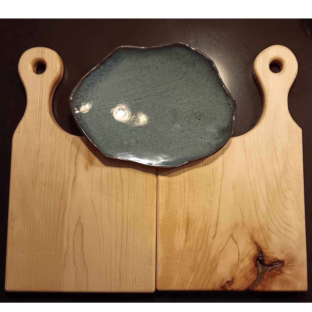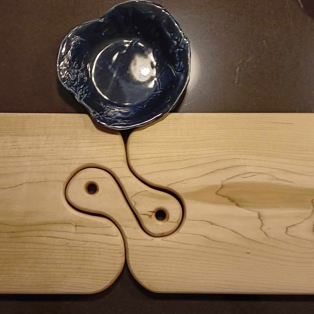 I retired from CNL in January 2021 and I have enough time now to still be involved with theatre and choral group as well as lots of visual arts. After finishing up a few home renovation projects, I found myself wanting to do something creative with clay. I saw the beautiful pots local potters were creating and I really wanted to learn how to do that. In January 2023, I joined the Deep River Potter’s Guild. They provided me with lessons and many opportunities to take workshops. Now I’m having a such a fun time creating some very interesting pieces. This past year, my husband and I started making charcuterie boards together, as gifts for friends and family. I loved how my bowls complemented these beautiful wooden charcuterie boards. Some of the boards were designed with a space for a pottery bowl. My favourite so far is my octopus bowl in the centre of an American hard maple charcuterie board.