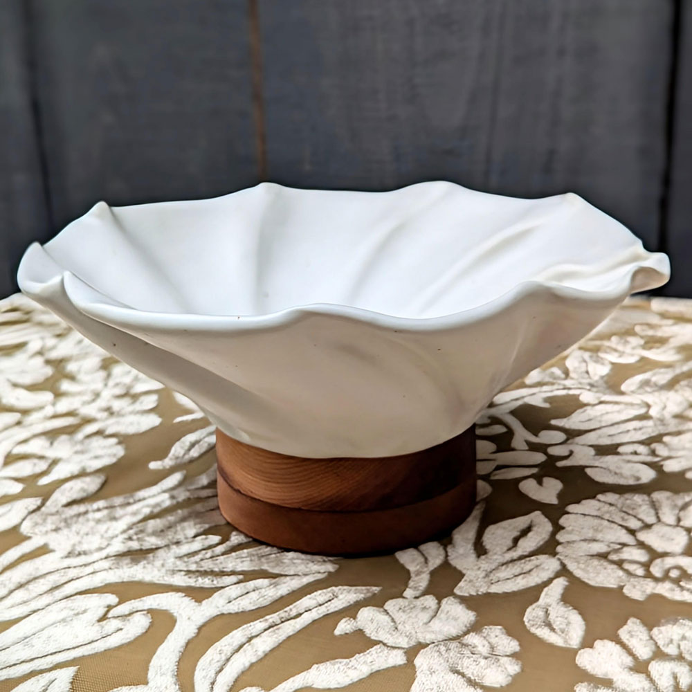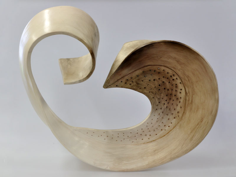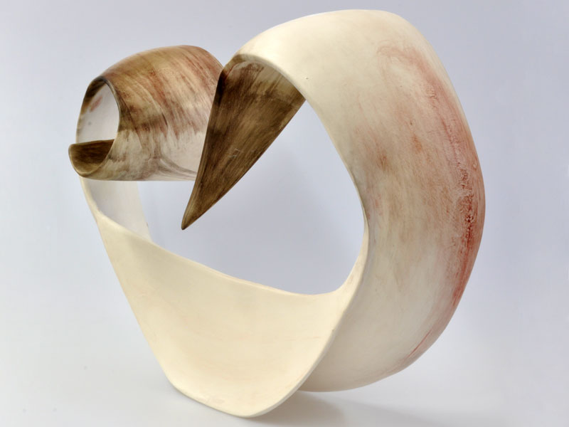 The beauty of the form is central to all of Carol’s ceramic art. Carol’s purely expressive, abstract porcelain sculptures, challenge her to create pieces with strong lines while conveying an underlying sense of simplicity. The forms are enhanced by the pure white surface without the need to add any other color or decoration. The shapes, intersection of the curving surfaces and the negative spaces that develop are carefully examined and refined during the forming process. With a loose idea of the intended form, the anticipation of how each new sculpture progresses keeps her fully engaged. The visual effect of the pieces when viewed from different angles are also carefully considered. Fragility is a recurring theme, compelling Carol to push the boundaries of the material. The pieces are finished with an exquisite burnished terra sigillata surface.