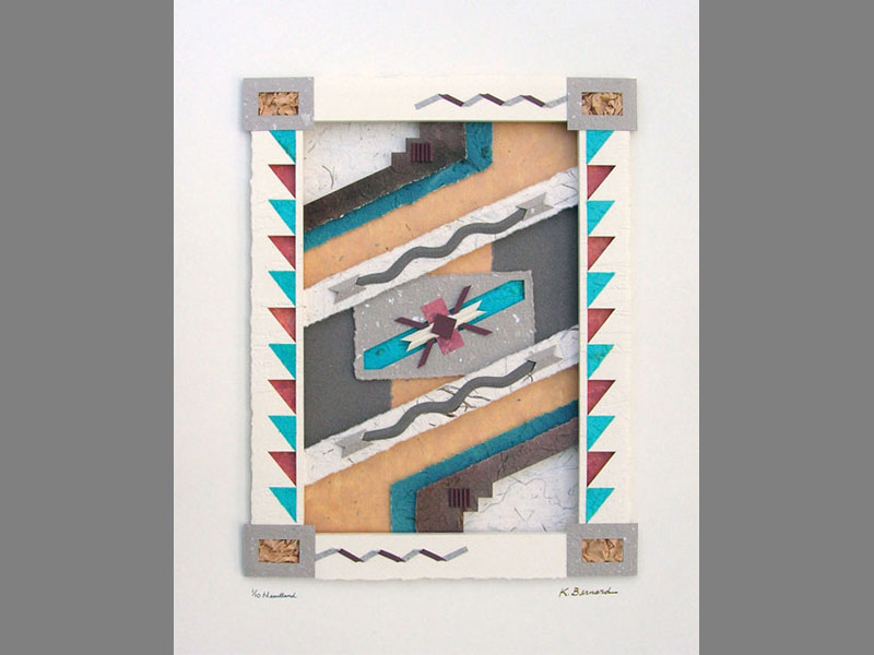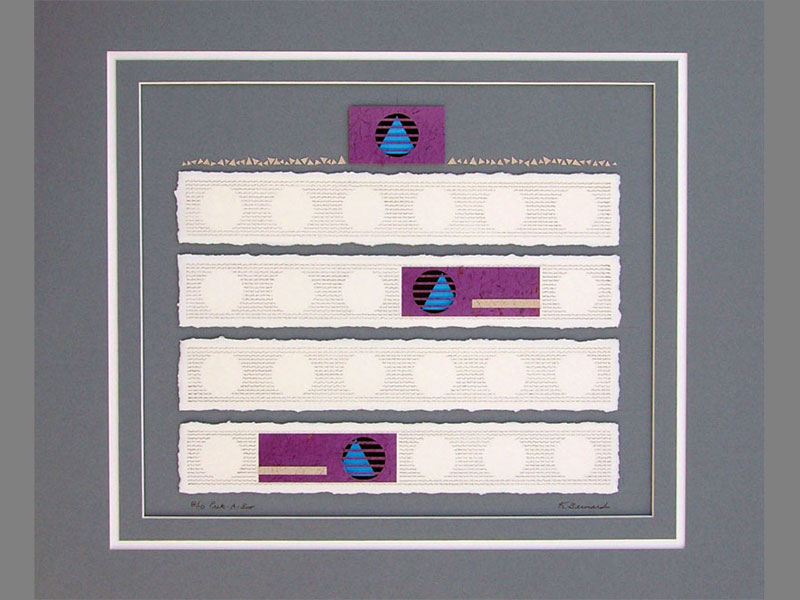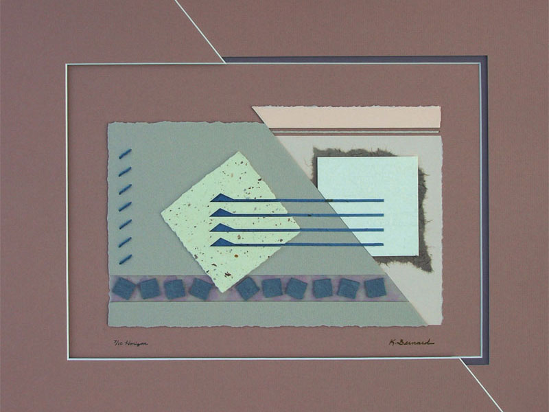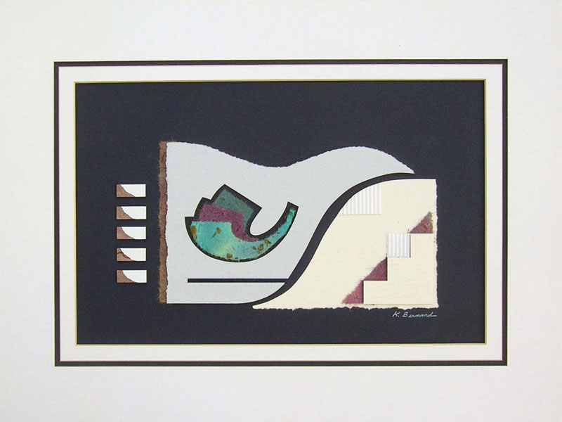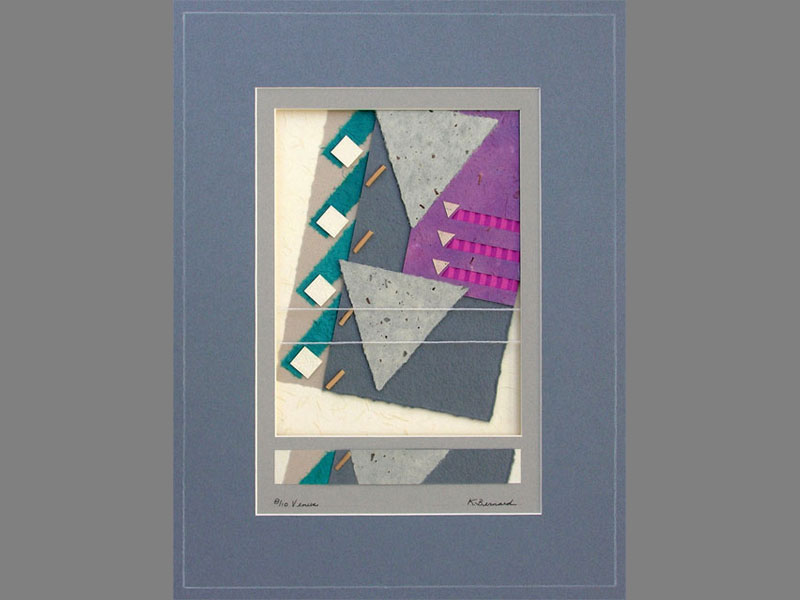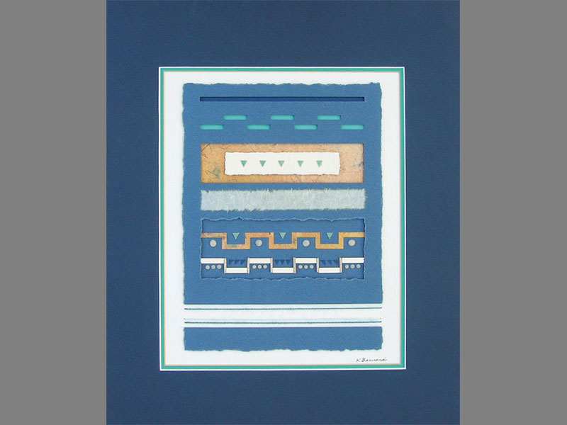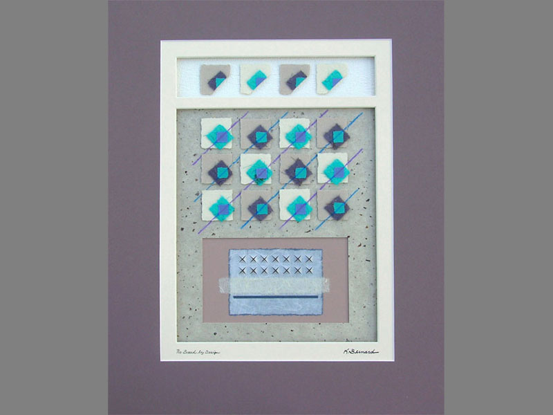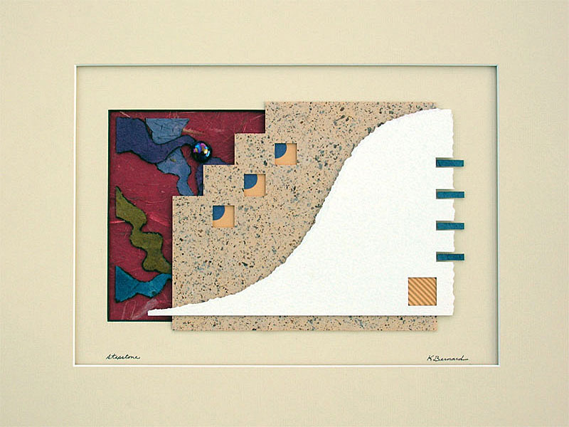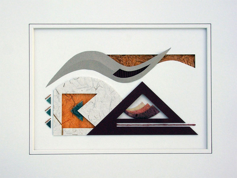 My paper sculpture relief pieces are abstract and use various papers I have collected over the years. The hand cut paper is then scored crumpled and layered to create abstracts with colour texture and balance. The selected mat board becomes an intricate piece of the work.