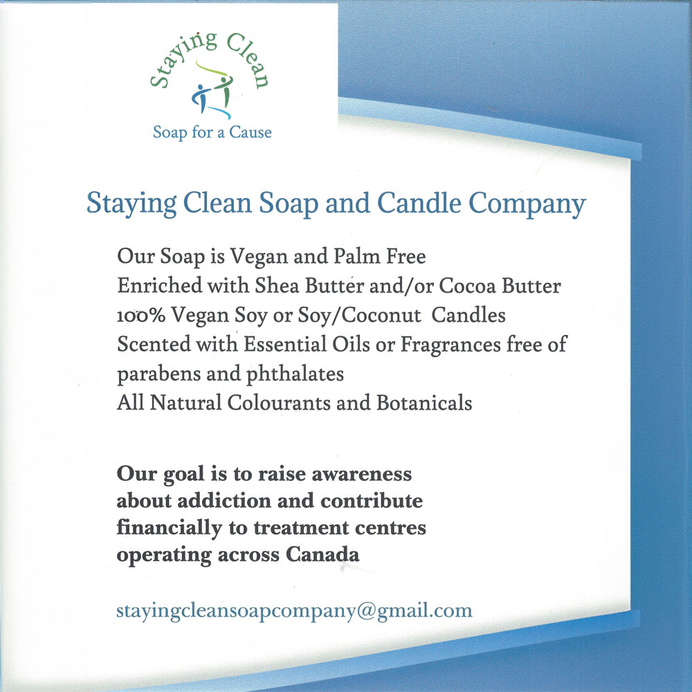Staying Clean Soap and Candle Company Inc. was started in 2023 to raise awareness about the crisis of addiction in society and to raise money for addiction treatment centers operating across Canada. One dollar from every product sale is donated to a Canadian addition treatment facility in the hopes that more people can be served when a choice is made to reach out for help.